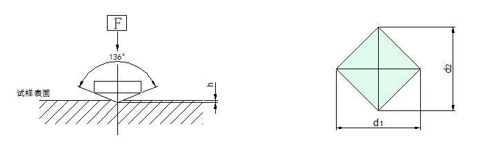 維氏硬度試驗是用136°正菱形金剛石壓頭,以規定試驗力(F)壓入被測試物體的表面,經規定的保持試驗力時間后,卸除試驗力,用測微目鏡測量試件表面的壓痕對角線(d),計算壓痕的錐形表面積所承受的平均壓力(N/mm2),即維氏硬度值。(詳見圖1.1)。